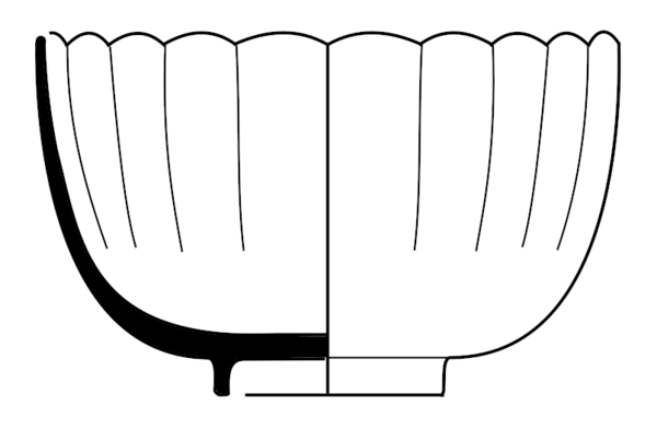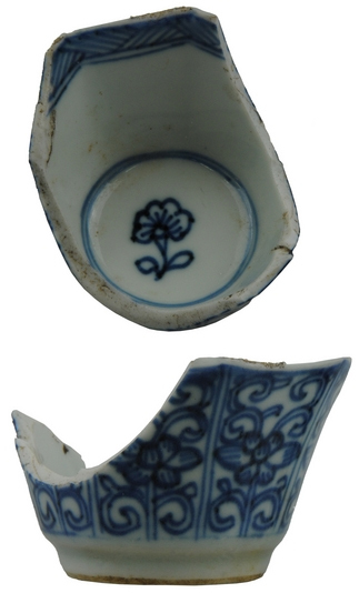| 5c | dubbelzijdige reliëfwand: verticale plooien en golvende rand; dubbelzijdig blauwe decoratie: uitwendig vlakverdeling met florale voorstellingen en figuren; inwendig een geometrische band onder de rand en een landschap met figuur, hutje, bootje, water en bomen op spiegel onderglazuur blauw |