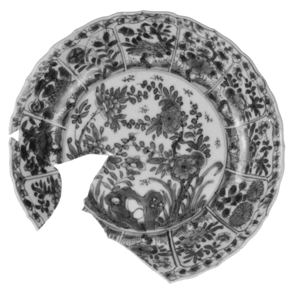| 5c | uitwendig: onderglazuur blauw: bloemen en takken; vlak: onderglazuur blauw: panelen met diverse bloemen; spiegel: onderglazuur blauw: rots en bloementuin onderglazuur blauw |