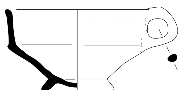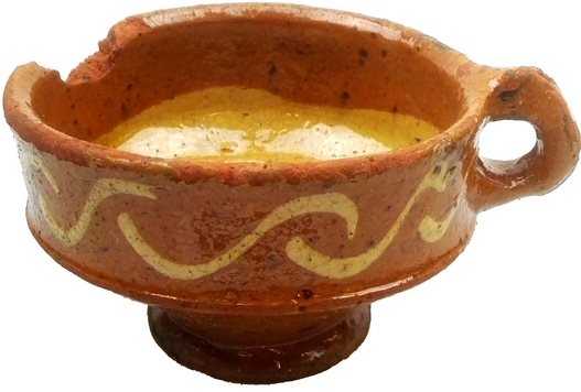 | 5c decoratie | inwendig witte slibengobe tot knik bodem-wand; uitwendig witte slibboogjes op wand |
