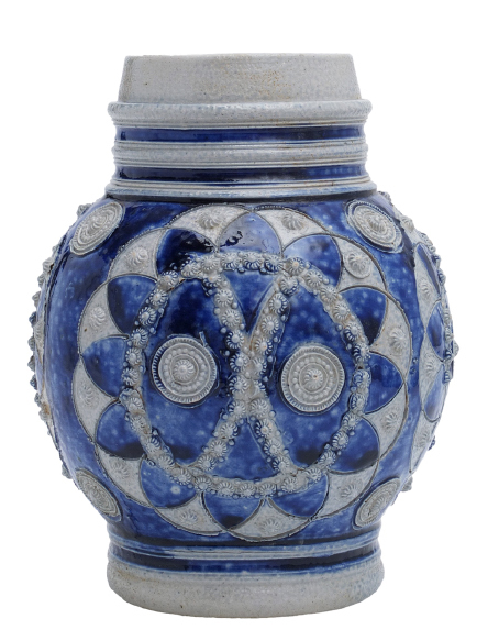 | 5c decoratie | ingekrast geometrisch bloemmotief met kleine bloemappliques in slingers, daartussen stempels blauw |
