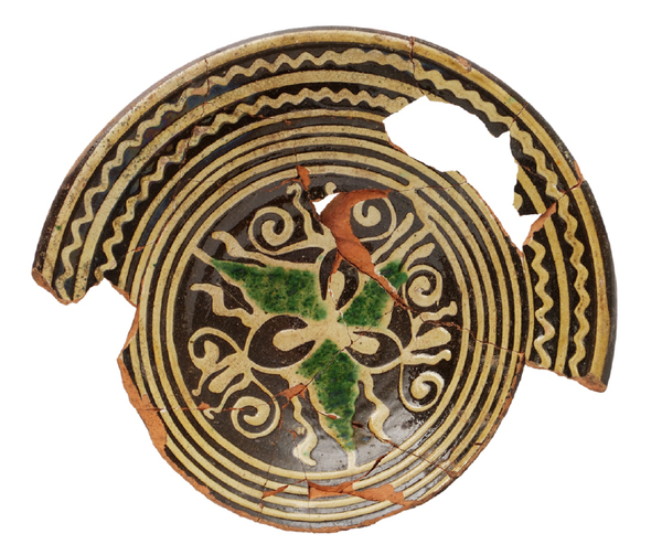 | 5c | geometrisch decor in slib met groene ruitvormen op de spiegel, gele concentrische lijnen en golflijnen over gehele oppervlak |