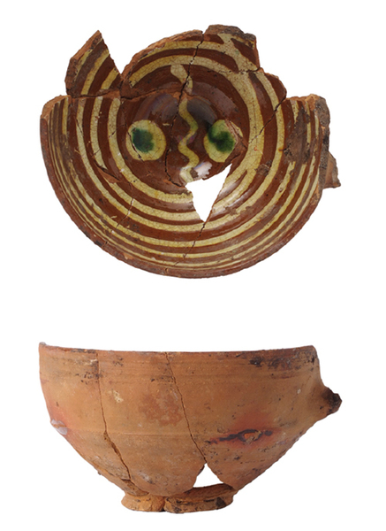 | 5c | inwendig slibversiering: gele concentrische lijnen en gestileerde geel en groene bloem op de bodem |