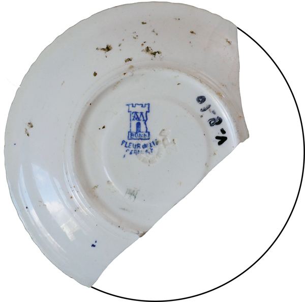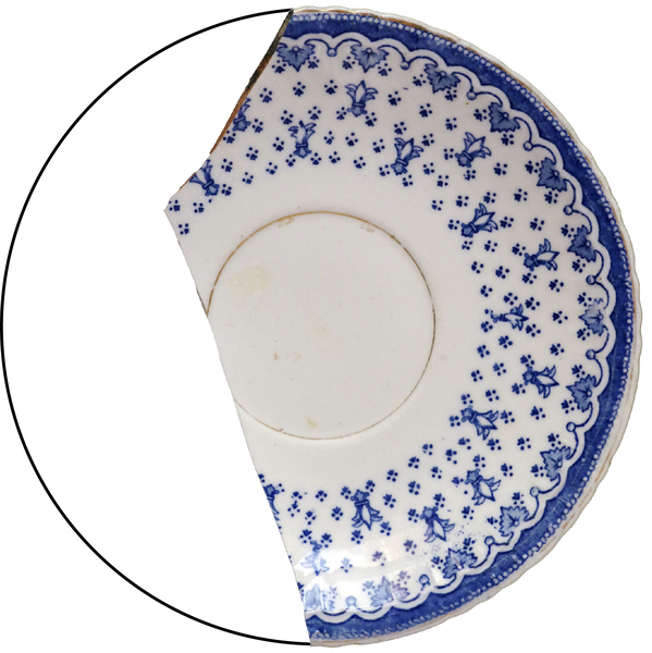 | 5c | transferprint: ornamentaal decor (blauw), gouden bies op rand |