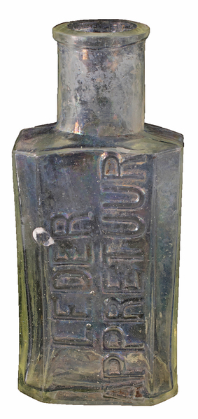 | 4b | rechthoekige fles met afgeschuinde hoeken, cilindrische hals, ook met schroefdraad, contactvorm met naden, ook met tekst en/of decoratie in reliëf, standvlak, ook met merk |