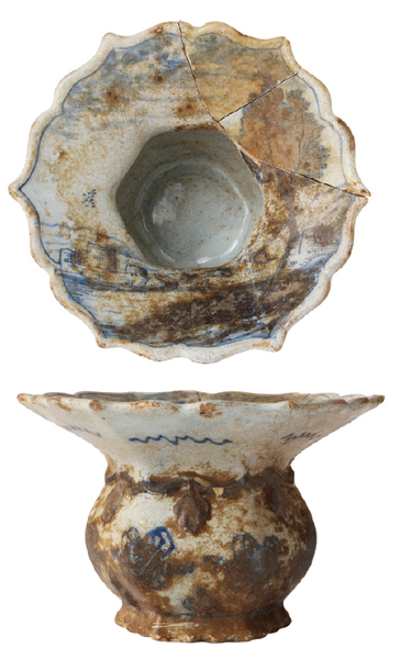 | 5c | rand: landschap; uitwendig: bloemen en reliëfdecor met guirlandes blauw |