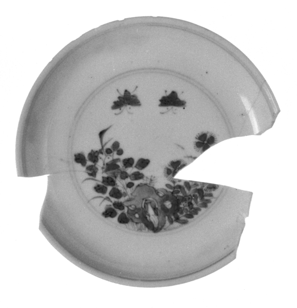 | 5c | uitwendig: onderglazuur blauw: bloemtakken; spiegel: onderglazuur blauw: twee vlinders boven bloemen bij een rots onderglazuur blauw |