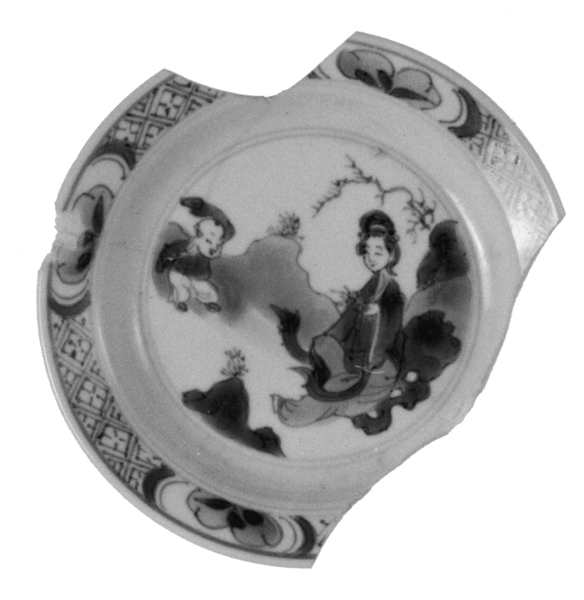 | 5c | vlag: onderglazuur blauw: servetwerk met medaillons; spiegel: onderglazuur blauw: twee parels, twee ruiten onderglazuur blauw |