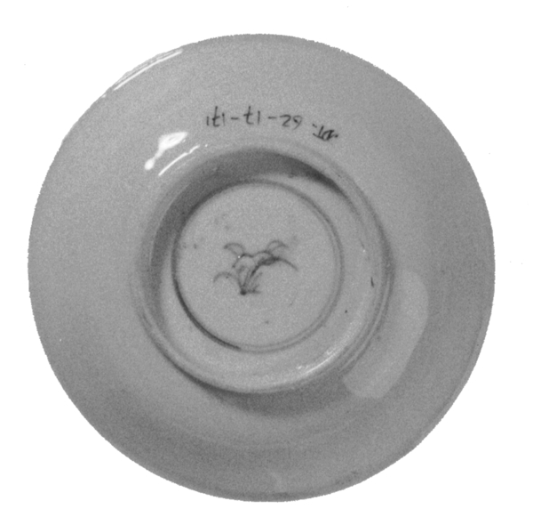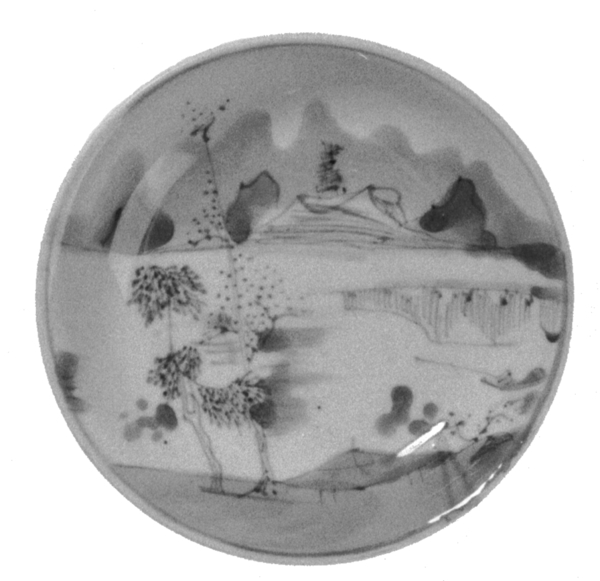 | 5c decoratie | inwendig: onderglazuur blauw: landschap aan rivier, twee concentrische cirkels binnen standring onderglazuur blauw |