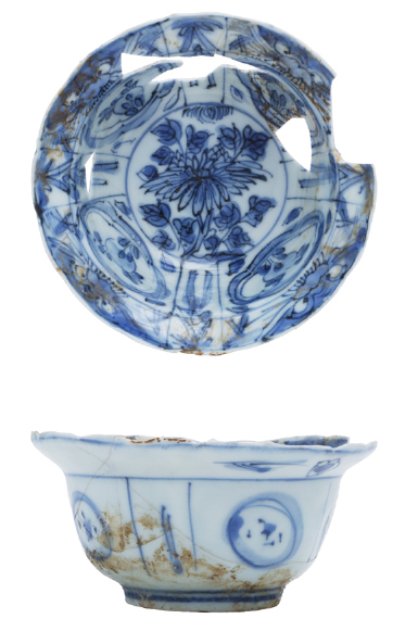| 5c decoratie | op rand en inwendig op wand: panelen met afwisselend taotie maskers/perziken en hangende linten, bodem: chrysant aan tak; uitwendig: vlot geschilderde panelen onderglazuur blauw |