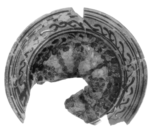 | 5c decoratie | inwendig: onderglazuur slib; vlag: meander in bruin en groen inwendig: groen en rood |