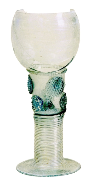 | 4b | roemer met ei-of tonvormige cuppa, geribde draad op de overgang naar de schacht en één of meer verspringende rijen braamnoppen, opgestoken bodem met pontilmerk, naar boven cilindrisch uitlopende hoge gewonden gewonden draadvoet |