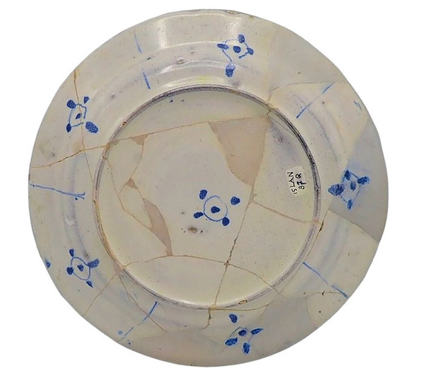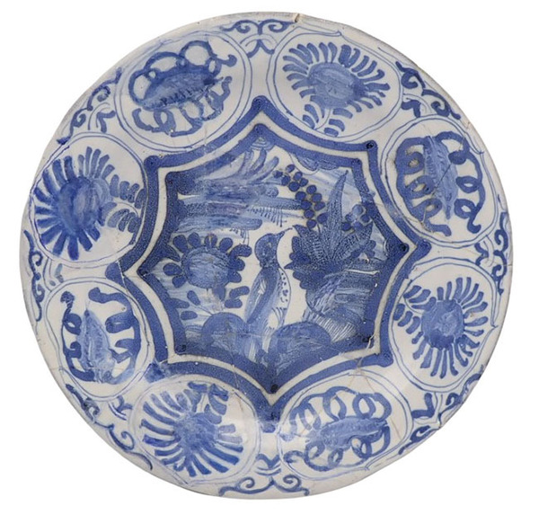 | 5c | imitatie kraakporselein: bovenzijde vogel en bloemen in stervormige rand, omgeven door cartouches met bloemmotieven; onderzijde strepen en vijfstip bloemetjes onder vlag en bodem blauw |