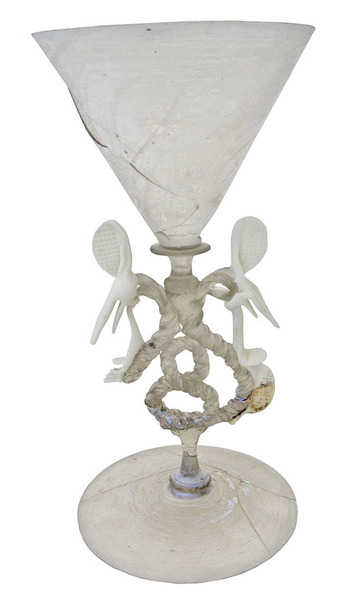 | 4b | trechtervormig kelkglas met of zonder afgeronde bodem, met uit getordeerde draden opgebouwde stam in een dubbele lus, ook met een achtvorm en met vleugels, schijfvormige voet met pontilmerk |