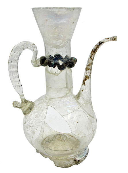 | 4b | bolvormige kan met lange cilindrische hals en uitstaande lip, met tuit en oor, gegolfde draad om de hals, opgestoken schijfvormige voet of voetring, pontilmerk |