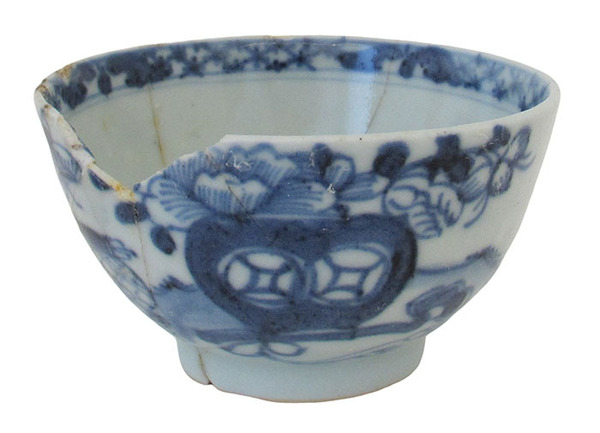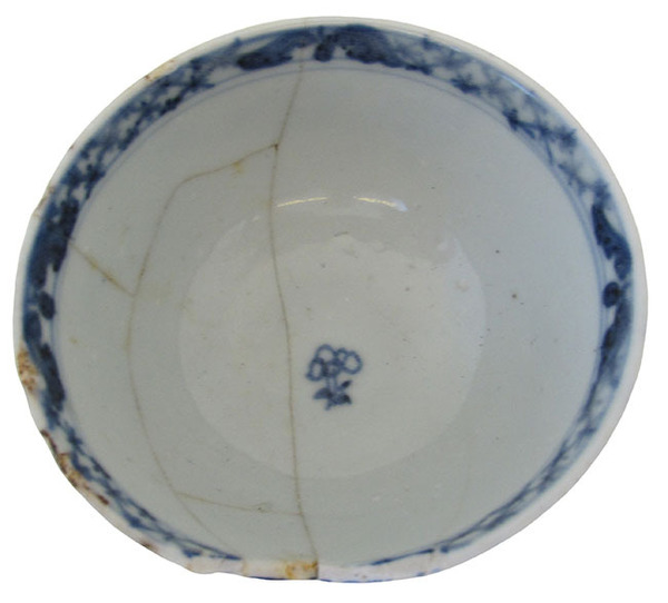 | 5c decoratie | inwendig: op de bodem een bloempje en langs de rand een smal fries met servetwerk en bloemen; uitwendig: vazenpaar met pioenen onderglazuur blauw |