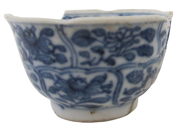 | 5c decoratie | inwendig: op de bodem een rozet en guirlandes langs de rand; uitwendig: vakken met bloemen onderglazuur blauw |
