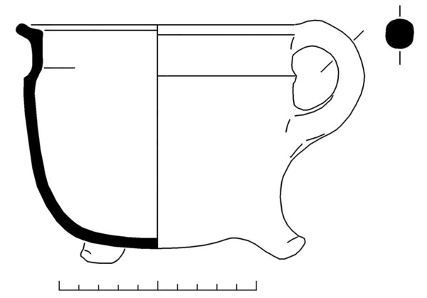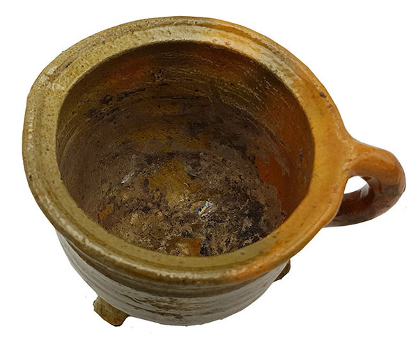 | 5d diversen | decoratief met groene reductievlekken; licht beroete onderzijde, inwendig schraapsporen op de bodem, eroverheen vaalbruine kalkaanslag; gebruikt als pispot |
