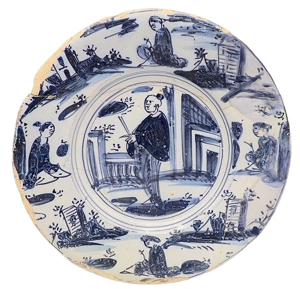 | 5c | donkerblauw beschilderd Chinees, naar Overgangsporselein, centraal: Chinese man bij gebouwen in cirkel; op de vlag: viermaal Hollands dorpsgezicht en viermaal zittende Chinees; onderzijde onversierd blauw |