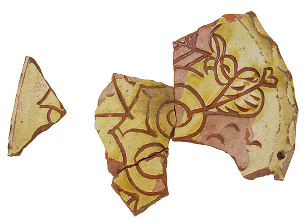 | 5c | schulprand, bovenzijde gele slib met sgraffito van bourgondische vuurslag met gekruiste pijlen |