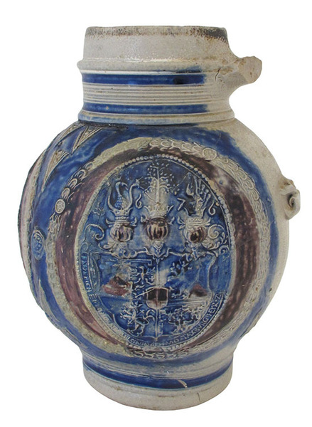 | 5c decoratie | appliques van tweemaal medaillon met wapen van vier kwartieren met twee adelaars en twee leeuwen onder drie helmtekens waarvan één met kroon; randschrift: FRIDERICH EMICH GRAF ..V LEININ..E..VND TAXBVRG HERR ZV ... en jaartal 1676; tussen de medaillons driehoeken en rozetten blauw, paars krul bij ooraanzet |