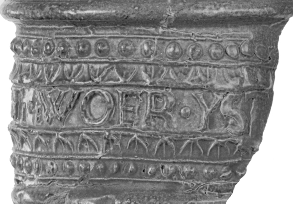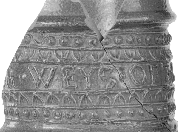 | 5c decoratie | uitwendig: wafeldecor, op hals band met randschrift '..R. WEYSO.OFT.eWOER.YST…' |