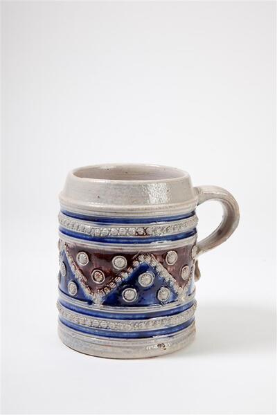 | 5c decoratie | In middenbaan zigzaglijn met nopjes en uitgespaarde driehoeken, boven paars en onder blauw met elk drie noppen; lijnen boven en onder de noppenbaan langs rand en bodem blauw blauw, paars |
