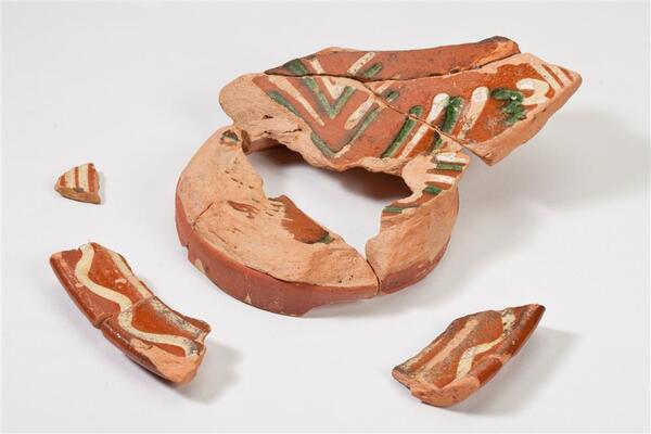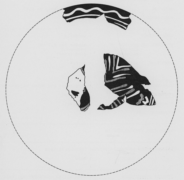 | 5c | slibversiering in ringeloortechniek: vier groepen van vier boven elkaar geplaatste V-vormige lijnen die in een kruis zijn geplaatst. Naar de rand toe boven elke groep twee korte golflijntjes, op de rand omgeven door vier tot zes cirkellijnen en een gegolfde lijn; versiering op fond afwisselend groen en geel |