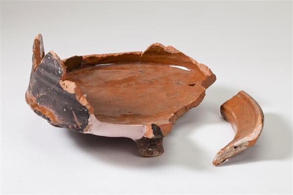 | 5d | ondergang schip na 1685; bodem- en randfragment; behoort gezien stratigrafische positie mogelijk niet tot de scheepsinventaris; buitenkant zwaar beroet, sterke slijtage aan pootjes |