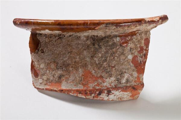 | 5d diversen | ondergang schip na 1685; randscherf; behoort gezien stratigrafische positie mogelijk niet tot de scheepsinventaris; zeepokken en mosdiertjes |