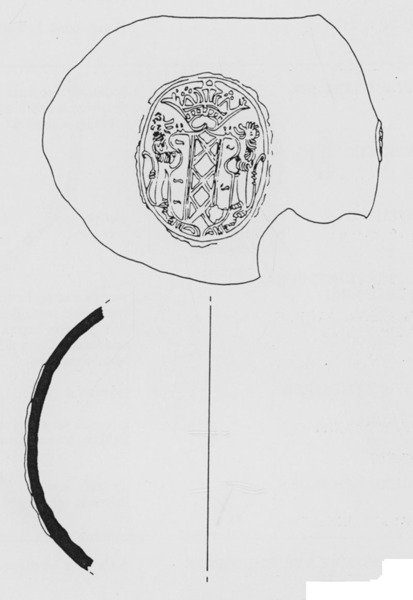 | 5c decoratie | sinaasappelhuid; ovaal medaillon met twee klimmende leeuwen en gekroond schild met wapen van Amsterdam, op de rand van de scherf aanzet van een tweede medaillon baardmankruik |