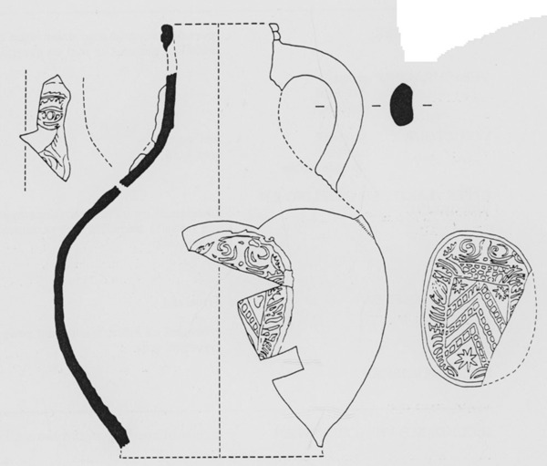 | 5d diversen | de kruik heeft op de grootste omtrek waarschijnlijk drie identieke medaillons gehad |