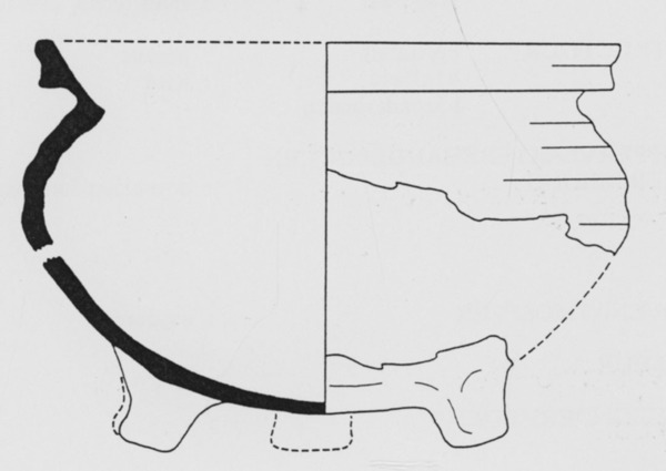 | 5d | gebruikssporen (krassen) op binnenkant en slijtage aan pootjes; (roet?)aanslag op buitenkant; mogelijk met schenklip, een- of twee-orige grape kookpot |