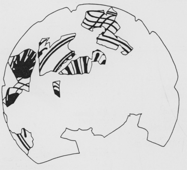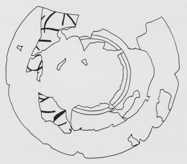 | 5c | donkerblauwe decoratie op fond, tweemaal twee cirkels waarbinnen gestileerde bloem(?), op rand twee cirkels waarbinnen waarschijnlijk twee tegenover elkaar aangebrachte dubbele gestileerde bladeren waartussen een streeppatroon van drie S-vormige lijnen die drie andere S-vormige lijnen kruisen. Op de onderzijde elkaar kruisende gebogen lijnen blauw |