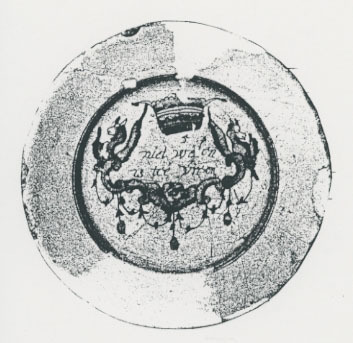 | 5c decoratie | op spiegel: kroon en grotesken en tekst: 5 / niet wel en / is tee veen blauw |