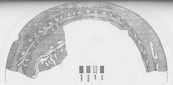 | 5c | sliblaag met versiering in marmertechniek in rood, geel, oranje en groen |