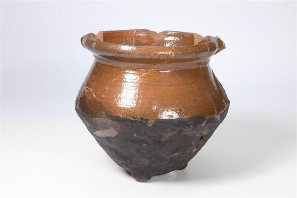 | 5d diversen | schenklip; gebruikt met afgebroken oor, sterk afgesleten pootjes, afgesleten en beschadigde rand; krassen en vettige roet- of teeraanslag op de binnen- en buitenkant |