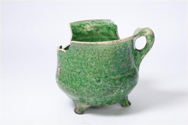 | 5d | afgesleten pootjes, beschadigde rand, waarschijnlijk gebruikt ondanks ontbreken van driehoekige scherf naast het oor, lichte roetsporen op de pootjes. Gebruikt voor verwarmen van inhoud? |