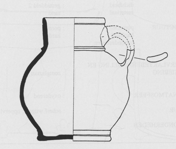 | 4b | kan met afgeronde buikknik en iets toelopende hals met ribbel op halsaanzet en groef onderlangs rand, standvoet |