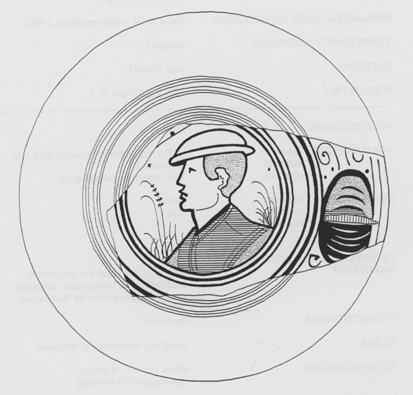 | 5c | decoratie in blauw, groen geel en oranje: profiel van mannen portret inwendig: polychroom |