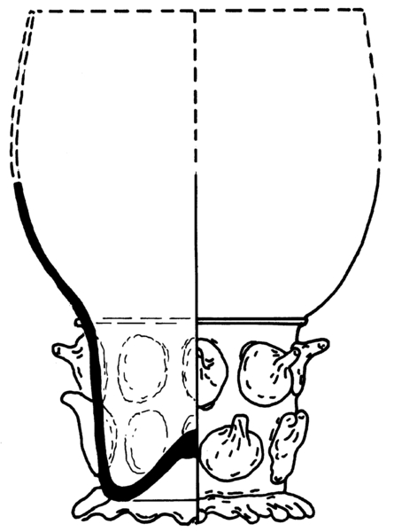 | 4b | roemer met eivormige cuppa , draad op de overgang naar de schacht en twee of meer verspringende rijen puntnoppen, opgestoken bodem met pontilmerk, geknepen voetring |