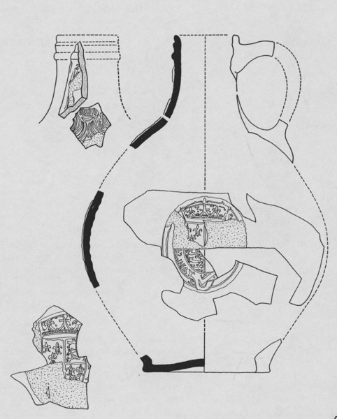 | 5c decoratie | drie medaillons met gekroond wapenschild van Elisabeth I en randschrift: HONI SOIT QUI MAL Y PENSE; voorzijde baardmanmasker baardmankruik |