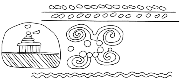 | 5c decoratie | radgravure: uitwendig: paviljoen in cartouche, krul motief, golflijn |