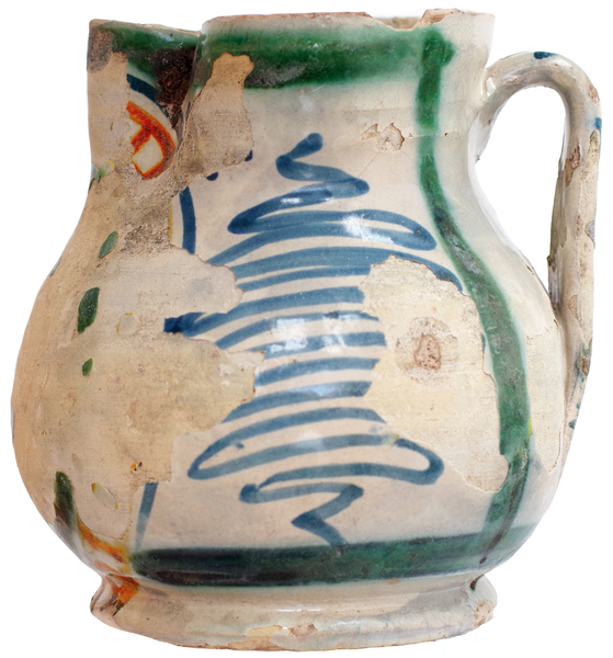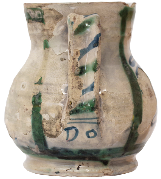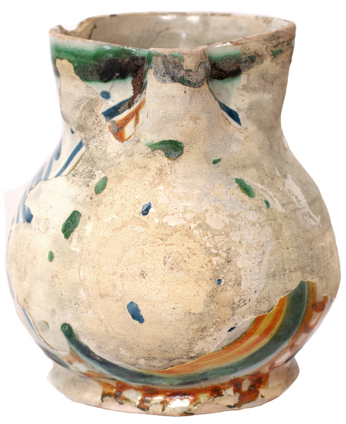 | 5c decoratie | beschildering: antimoongeel, ijzerbruin, kobaltblauw en kopergroen; voorkant buik: afgabladderd, zijkant: grof zigzag/spiraal-motief, achterzijde: wit |