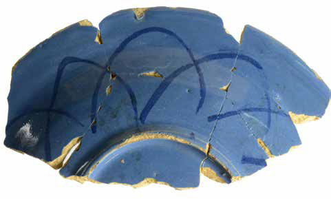 | 5c decoratie | donkerblauwe beschildering op blauwe ondergrond: voorzijde: palmbladeren, achterzijde: bogen blauw |