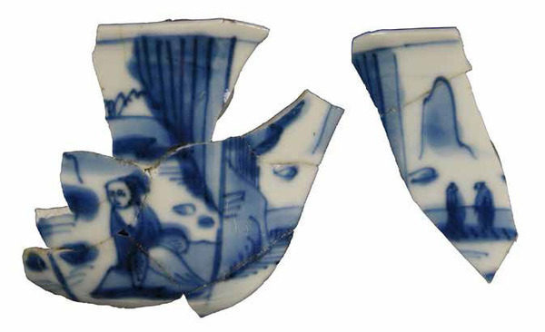 | 5c decoratie | blauwe beschildering; uitwendig: panelen met Chinese figuren in landschap onderglazuur blauw |