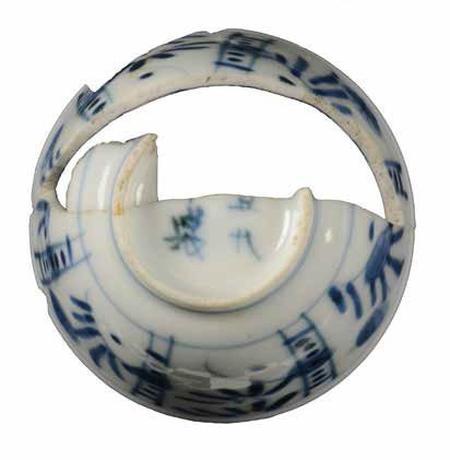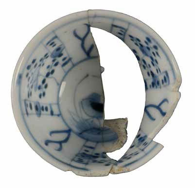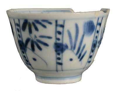 | 5c decoratie | blauwe beschildering: panelen met florale motieven; bodem: vogel; onderkant: karaktertekens onderglazuur blauw |
