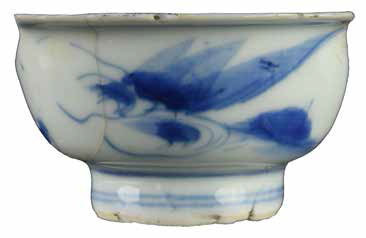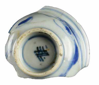 | 5c decoratie | blauwe beschildering; uitwendig: landschap?; onderkant: merk onderglazuur blauw |