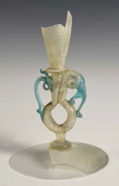 | 4b | fluitglas met uit draden opgebouwde asymetrische stam, schijfvormige voet met pontilmerk |