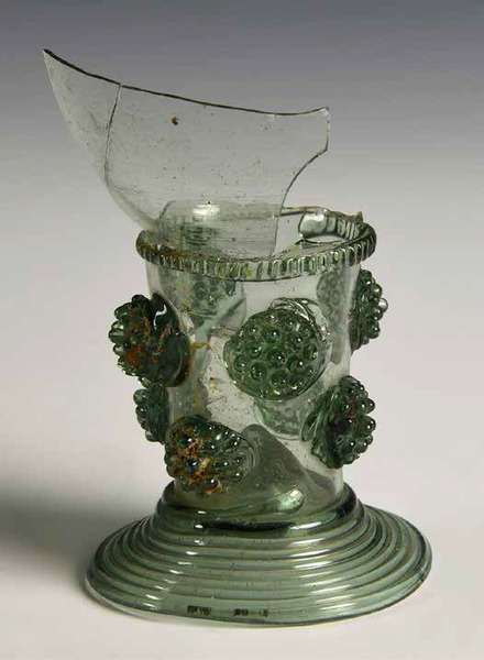 | 4b vorm | roemer met ei- of tonvormige cuppa, geribde draad op de overgang naar de schacht en één of meer verspringende rijen braamnoppen, opgestoken bodem met pontilmerk, gewonden draadvoet |