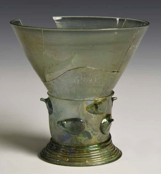 | 4b vorm | roemer met conische cuppa, draad op de overgang naar de schacht en twee of meer verspringende horizontale rijen puntnoppen, opgestoken bodem met pontilmerk, gewonden draadvoet |